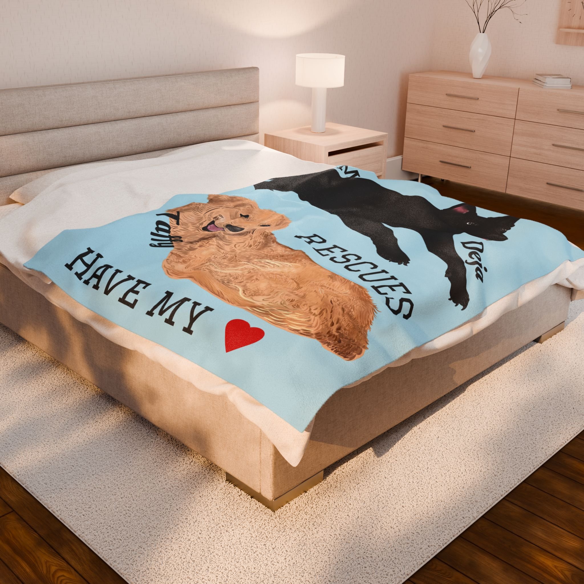 This velveteen plush blanket wraps you in quiet comfort and the kind of cozy that feels like home. Soft, slightly weighted fabric drapes easily over laps and couches, showcasing a vivid, single-sided print of two rescue dogs—custom drawing of your choice—set against a calming pale-blue background or specify a color of your choice. Lightweight enough for year-round snuggling, yet substantial enough to use during cool evenings, it brings a gentle, personal touch to the living room, bedroom, or reading nook. The double-stitched edges hold up to frequent use and washes, while the vibrant print keeps the artwork bright and detailed. For people who live to care for animals, this blanket reads like a small, warm celebration of the rescues who share their life. Perfect for Valentines Day!